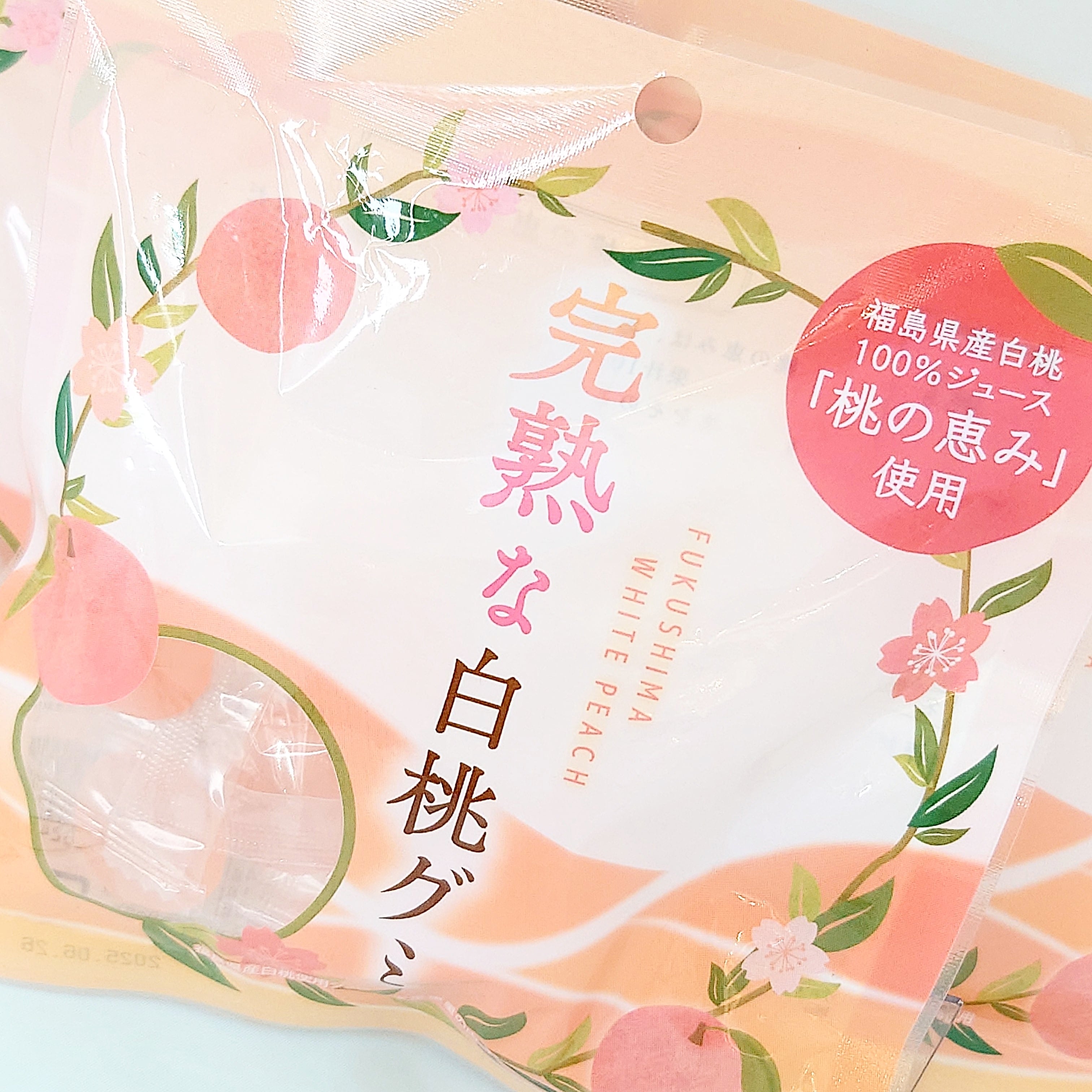 【原材料】水飴(国内製造)・砂糖・ゼラチン・イソマルトオリゴ糖・ももシュース・植物油脂・粉末オブラート・澱粉/ソルビトール・酸味料・香料・着色料(赤3・赤106)・光沢剤・(一部にゼラチン・もも・大豆を含む)